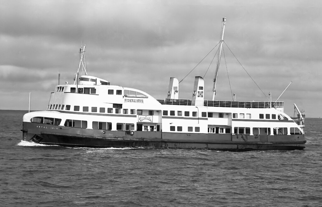 But getting back to the 1950s when ‘our’ Royal Iris was launched by Denny Bros., Dumbarton on 8 December 1950 and entered service on 5th May 1951. With a length of 159ft., beam of 48ft., draft of 9ft. and tonnage of1.234grt. Her four Ruston & Hornsby 4SA-6cylinder diesel engines powered four generators, each 300 kW/300v DC-connected to two electric motors, each 730shp and 2 shafts coupled to twin controllable pitch propellors gave a speed of 12knots. Her twin rudders provided enhanced manoeuvrability.